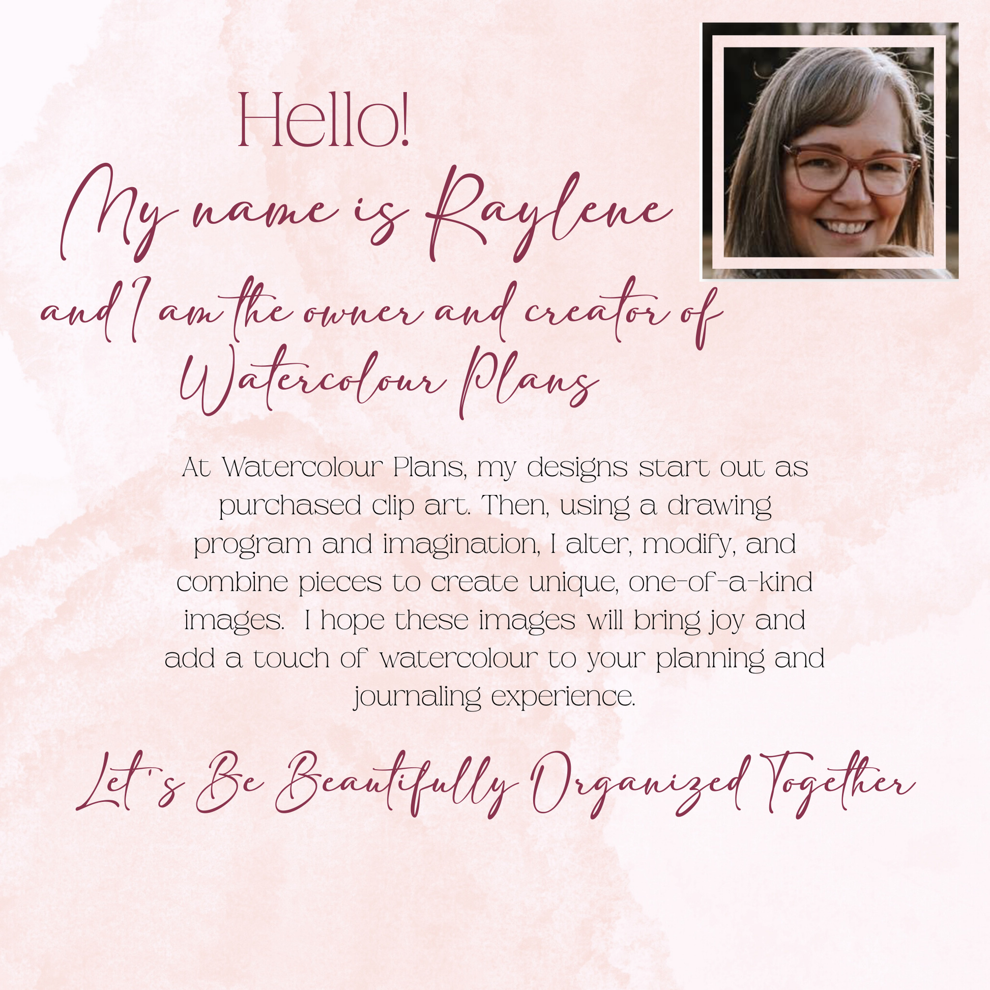 At Watercolour Plans, my designs start out as purchased clip art. Then, using a drawing program and imagination, I alter, modify, and combine pieces to create unique, one-of-a-kind images. I hope these images will bring joy and add a touch of watercolour to your planning and journaling experience.